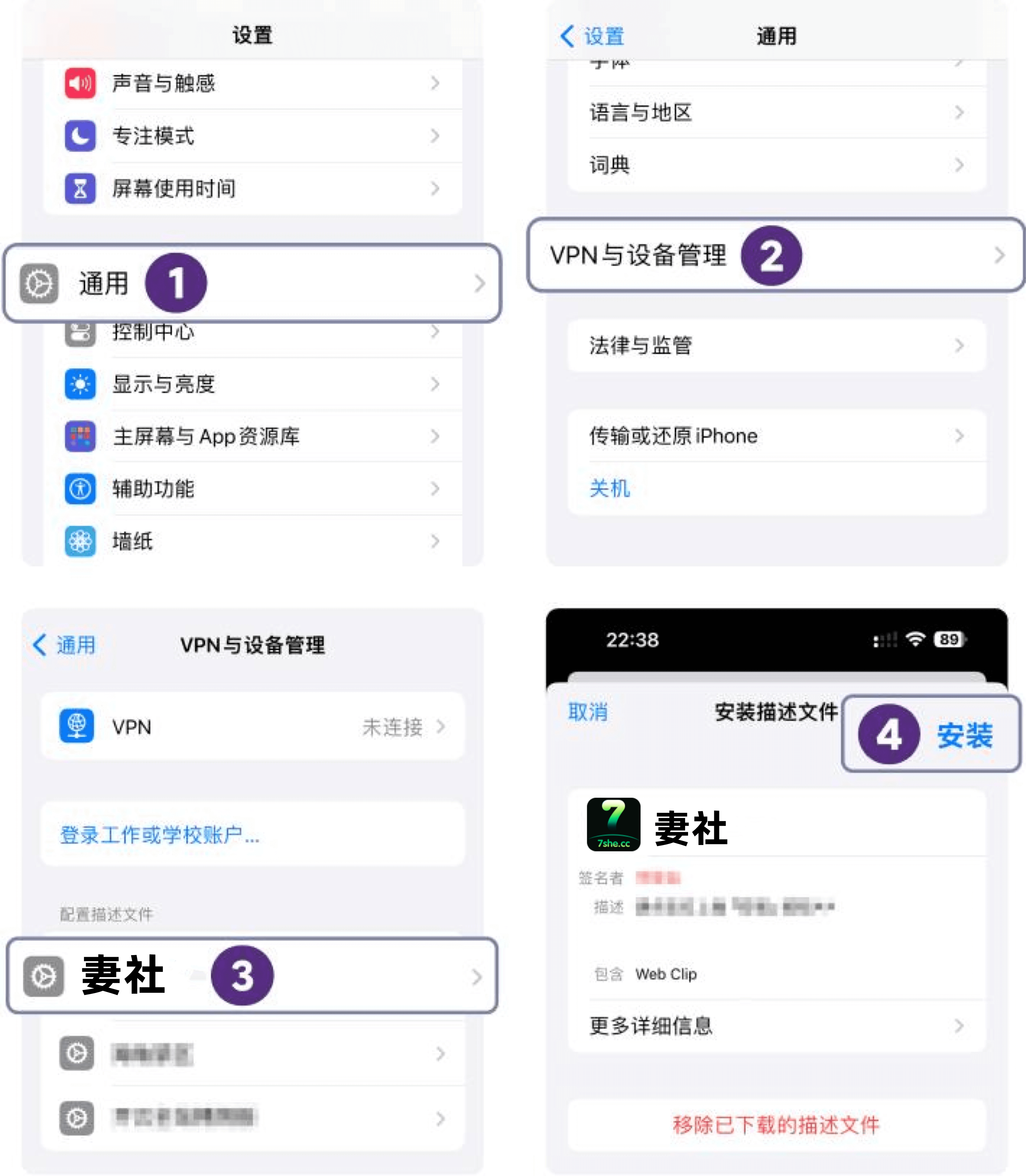 2,安装步骤:下载描述文件后,请前往【设置→通用→设备管理→妻社→安装】